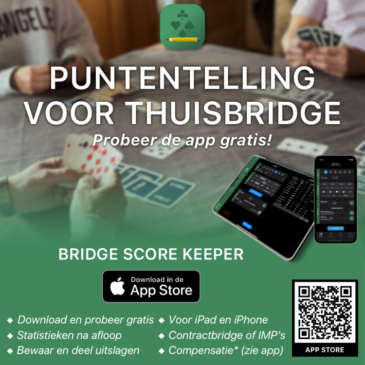 Weer zie je die hand rechts van je naar de biedbak gaan en weer komt die stopkaart eruit, gevolgd door 3♥. Dit is een eitje waar je geen seconde over hoeft na te denken. Je gaat passen. Omdat je de stopregel maar een stomme regel vindt, tel je demonstratief snel op je vingers tot 10 en, omdat jij jezelf zo grappig vindt, leg je breed glimlachend en met een extra knipoog die pas op tafel. De boodschap aan maat is duidelijk: ik heb niets, reken niet op mij. Maat, die in de uitpas zit, heeft het met deze volgende hand nu heel makkelijk: