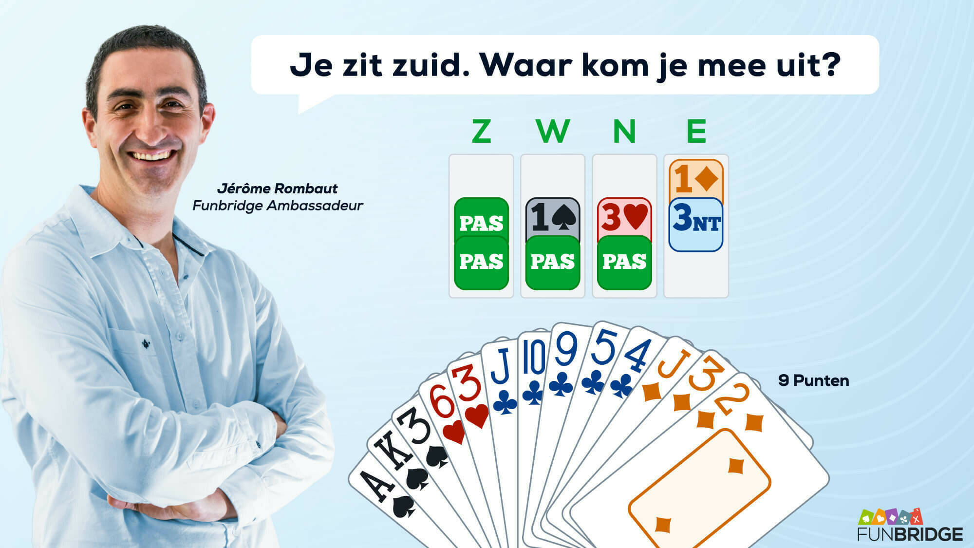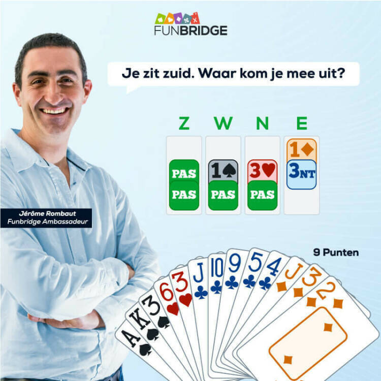 Nu partner in de derde hand heeft geopend, kan het verstandig blijken de bieding niet op de spits te drijven. Een andere manier om ongelukken te voorkomen: