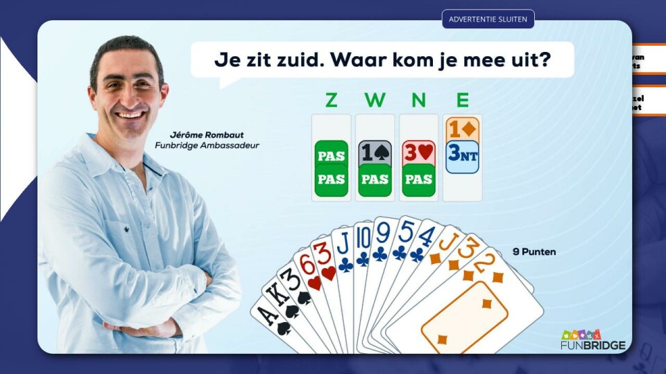 Bruijnsteen: “3SA. Met zo veel azen heb ik een mooie hand. Ik voel wel iets voor 4♠, maar als partner slechte troeven heeft, is dat niet goed. Passen vind ik een redelijke optie, maar dat lijkt me tegen het veld in.”