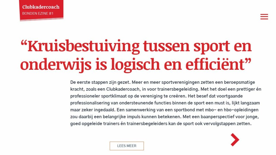 Er zijn, vanzelfsprekend, nu nog veel verschillende aanvliegroutes. Een aantal sportbonden doet bijvoorbeeld vanaf het eerste moment mee aan de ‘Proeftuinen Clubkadercoaching’, andere zijn aangehaakt bij de tweede tranche. En weer andere staan te popelen, of hebben juist nog geen initiatief getoond. Klomp: “Ik zie wel steeds meer enthousiasme. Er is natuurlijk geen bond die tegen adequate trainersbegeleiding is, iedereen wil dat trainers en coaches beter beslagen ten ijs komen. Maar ieder volgt een eigen pad, of heeft nog niet over de juiste route na kunnen denken.” Dat Clubkadercoaches bijvoorbeeld hun taak bij de club kunnen combineren met een andere functie bij de lokale overheid, vergroot de mogelijkheden aanzienlijk. Het is daardoor bijvoorbeeld mogelijk iemand voor een relatief bescheiden pakket aan te stellen, het vraagt niet direct grote investeringen. “Een win-winsituatie, waar niet alleen het onderwijs en de sportwereld van profiteren, maar uiteindelijk ook – wanneer het niveau van de trainingen en het spelplezier toenemen – ook je eigen kinderen voordeel van hebben.”