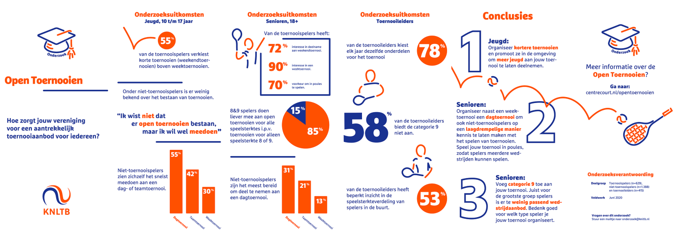 Er zijn veel verschillende soorten toernooien, geschikt voor alle leeftijden en ieder spelniveau. Maar welk toernooi past het beste bij jouw vereniging? Denk daarbij naast weektoernooien ook aan kortere toernooivormen, zoals dagtoernooien. Zeker onder jeugd is daar veel interesse in. Uit onderzoek blijkt dat van de toernooispelers tussen de 10 en de 17 jaar maar liefst 55 procent korte toernooien verkiest boven toernooien van een gehele week. Bovendien zijn korte vormen zoals dagtoernooien ook voor senioren een uitstekende, laagdrempelige manier om kennis te maken met toernooien. Van de niet-toernooispelers zou 55 procent als eerste deelname aan een dagtoernooi overwegen.