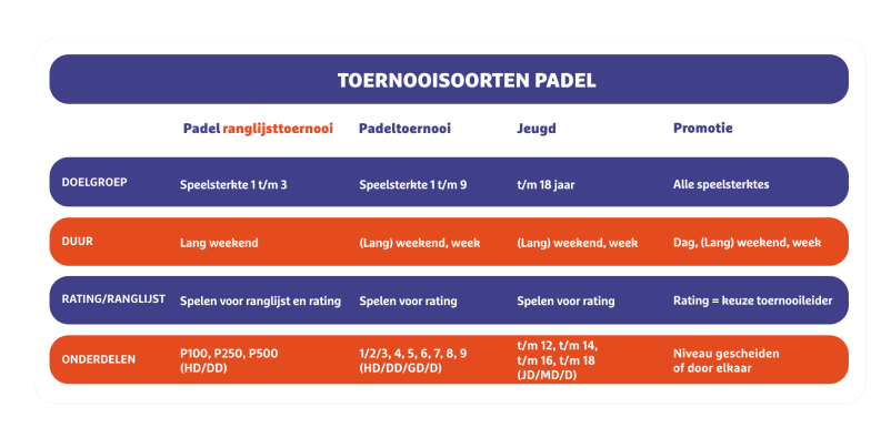 Het toernooicircuit in padel is niet te vergelijken met tennis en verdient daarom enige toelichting. In het toernooicircuit van padel wordt er gespeeld in verschillende speelsterkte categorieën van 1 t/m 9, waarbij speelsterkte 1/2/3 één categorie vormt. De overige speelsterktes (4 t/m 9) zijn losse speelsterkte categorieën. Spelers in de hoogste categorie kunnen ook punten verdienen voor de KNLTB Padelranglijst, in respectievelijk P500-, P250- en P100 padeltoernooien.