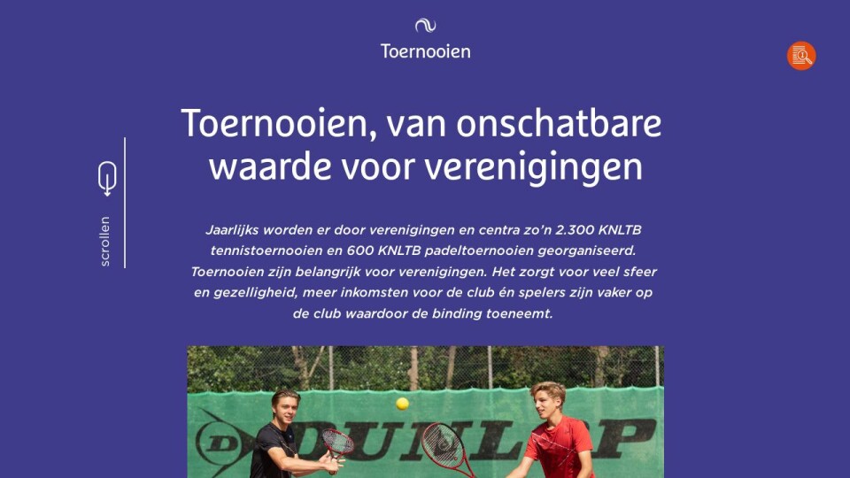 Jaarlijks worden er door verenigingen en centra zo’n 2.300 KNLTB tennistoernooien en 600 KNLTB padeltoernooien georganiseerd. Toernooien zijn belangrijk voor verenigingen. Het zorgt voor veel sfeer en gezelligheid, meer inkomsten voor de club én spelers zijn vaker op de club waardoor de binding toeneemt.