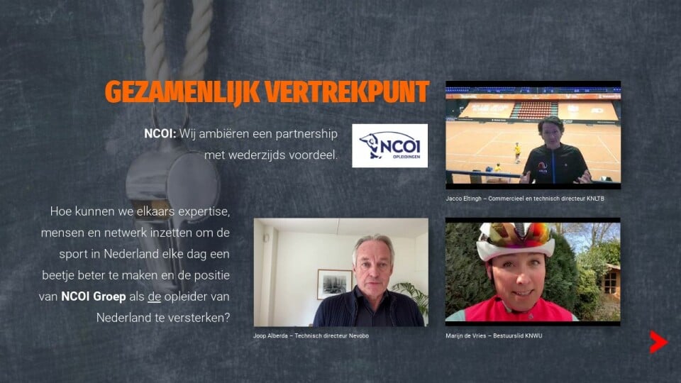 Hoe kunnen we elkaars expertise, mensen en netwerk inzetten om de sport in Nederland elke dag een beetje beter te maken en de positie van NCOI Groep als de opleider van Nederland te versterken?