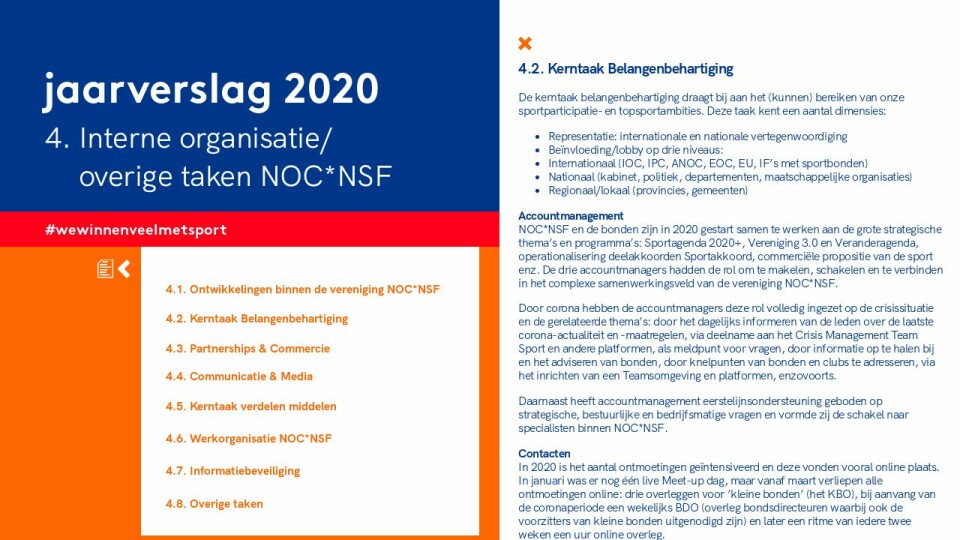 In 2020 heeft accountmanagement de ledencommunicatie verder geoptimaliseerd: coördinatie van een Outlook-kalender met alle georganiseerde NOC*NSF-bijeenkomsten, eindredactie van onze ledennieuwsbrief, het inrichten en de verdere doorontwikkeling van een specifiek ‘voor bonden’-deel op de vernieuwde website nocnsf.nl en adviserend in de overige deelprojecten van de ledencommunicatie als inventarisatie van de nieuwsbrieven en de platformen van NOC*NSF.